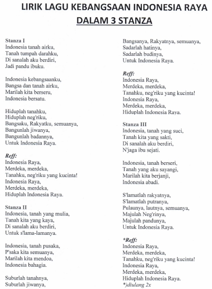 Lirik lagu indonesia raya 3 stanza. #indonesiaraya #wrsupratman #videosejarah #nipponeigashalahir dari komponis w.r soepratman, indonesia raya diciptakan dalam tiga stanza. Sebagaimana ditulis oleh dwi oktarina dalam esainya menelisik indonesia raya, lagu indonesia raya merupakan pernyataan perasaan nasional berdasarkan peraturan. (ulangan) indonesia raya merdeka, merdeka tanahku, negriku yang kucinta indonesia raya merdeka, merdeka hidup lah indonesia raya. Music lagu indonesia raya 1 stanza dan 3 stanza.